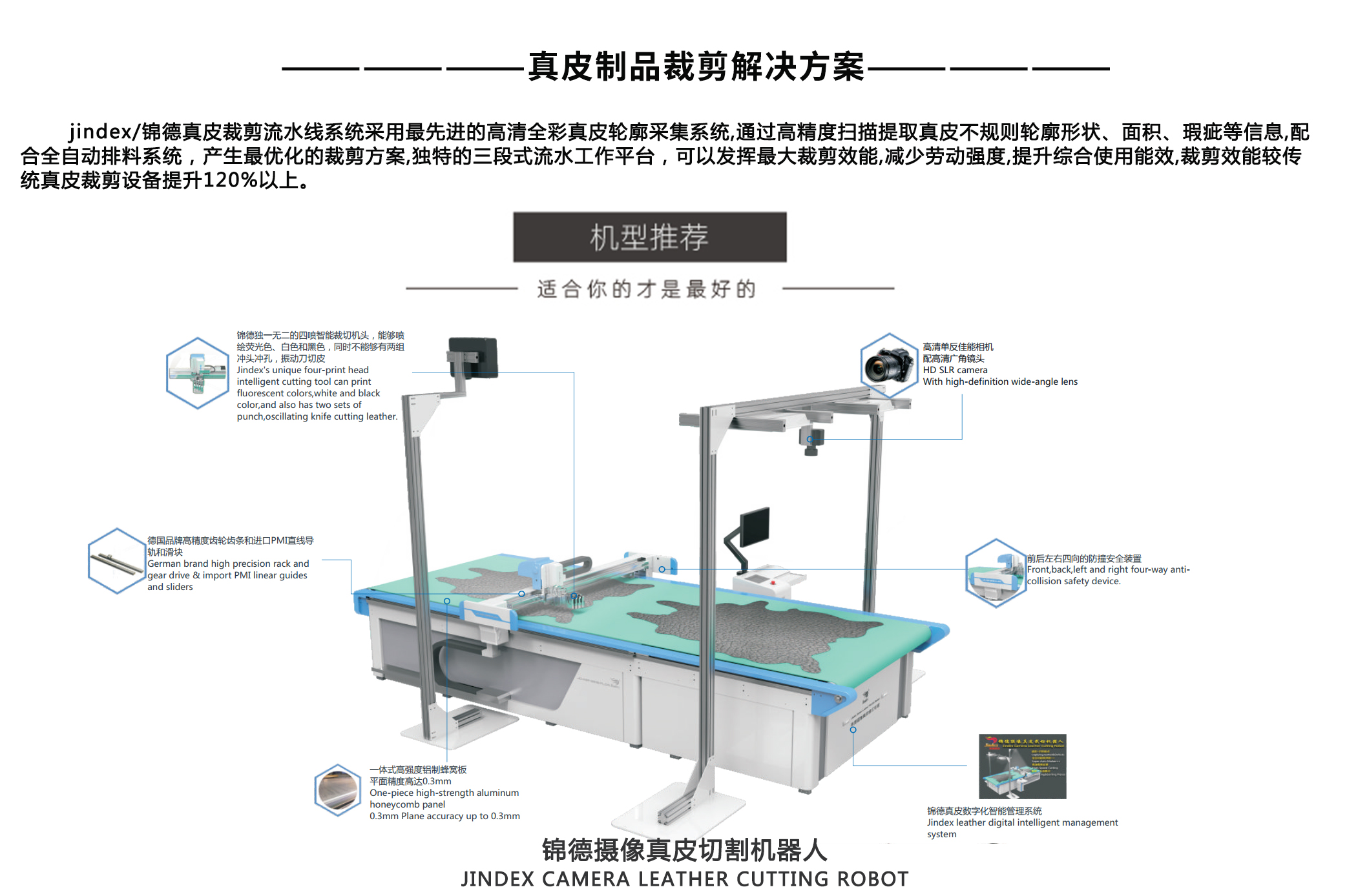 錦德真皮裁剪流水線系統(tǒng)采用先進(jìn)的高清全彩真皮輪廓采集系統(tǒng),通過高精度掃描...
