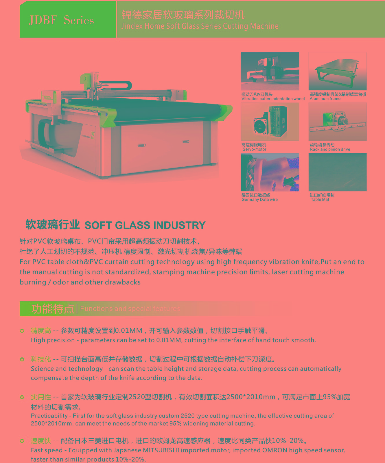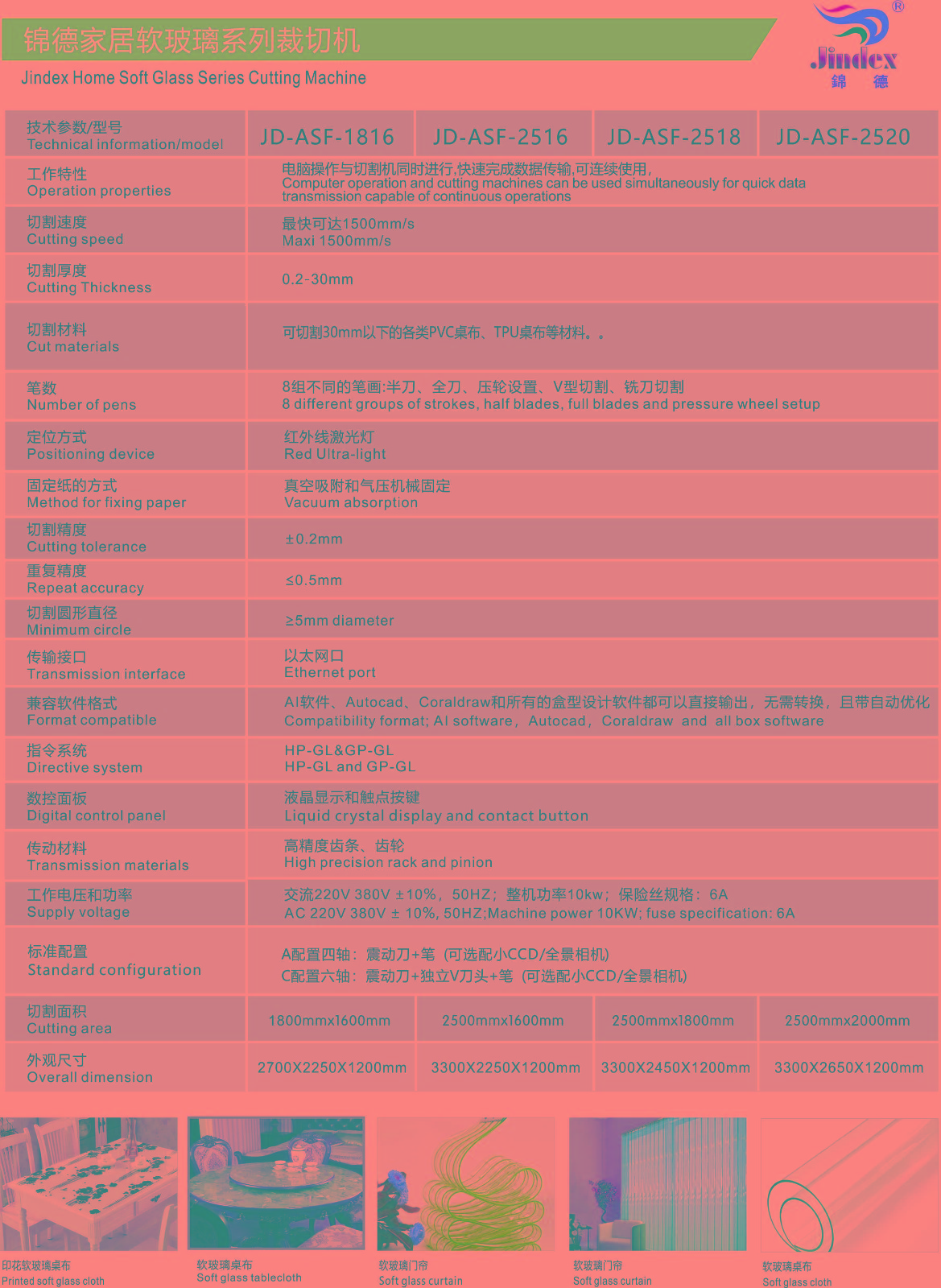 錦德振動刀自動裁剪機(jī),裁剪效率高,相比人工快5倍左右,相比激光快2倍左右;裁剪精度高,誤差小于0.02mm;高度鎢鋼刀片切割,可以裁剪任意異形材料;智能排版系統(tǒng),節(jié)省材料10%以上;環(huán)保無污染,響應(yīng)國家綠色生產(chǎn)的號召。 玻璃=pvc軟質(zhì)水晶板在工業(yè)、家庭使用的都很廣泛,pvc軟玻璃的特點(diǎn):耐熱、耐寒、耐光照、抗靜電、抗老化、耐重壓、耐強(qiáng)酸堿、透光性好、使用壽命長、不變形、不發(fā)碎、不發(fā)硬、高彈性、無毒無味等等!